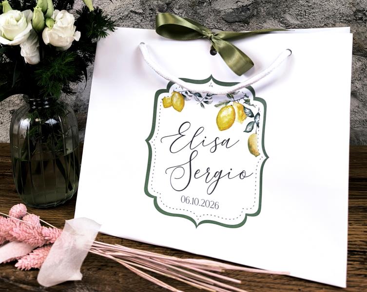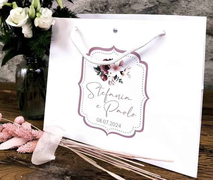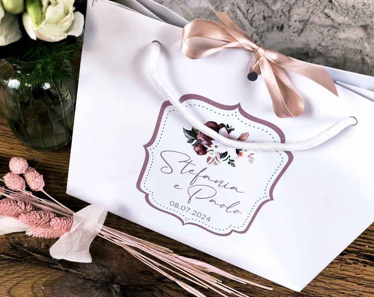 Wedding bag in carta, personalizzata con adesivo, disponibile in due varianti:verticale 18x21cm (spessore 8cm), lucida con manici in cotone orizzontale 24x20cm (spessore 14cm), opaca con manici in cotone