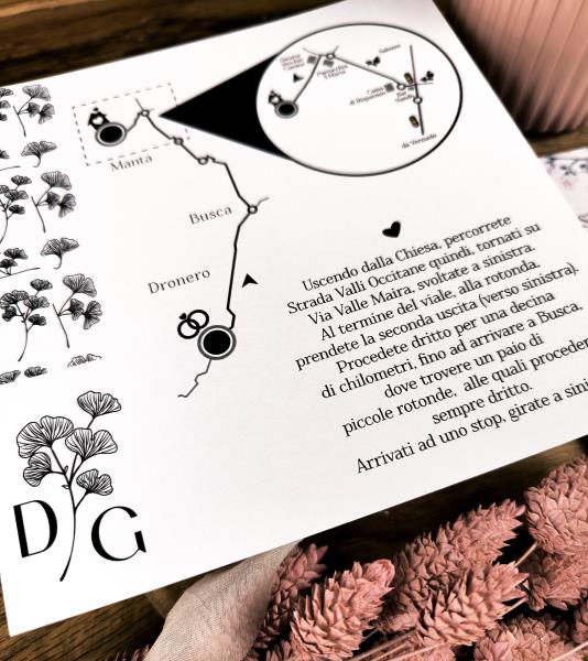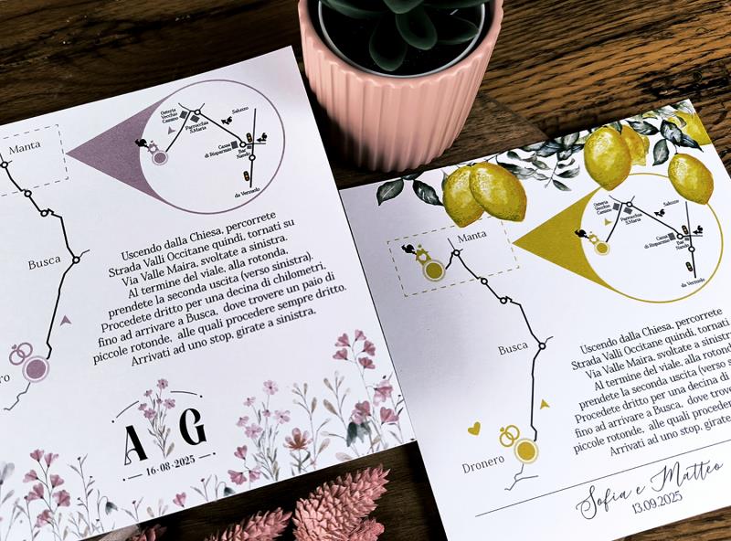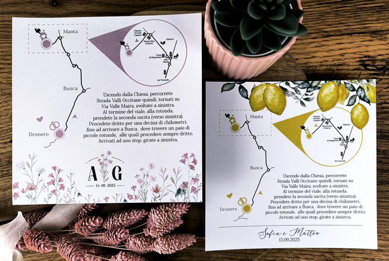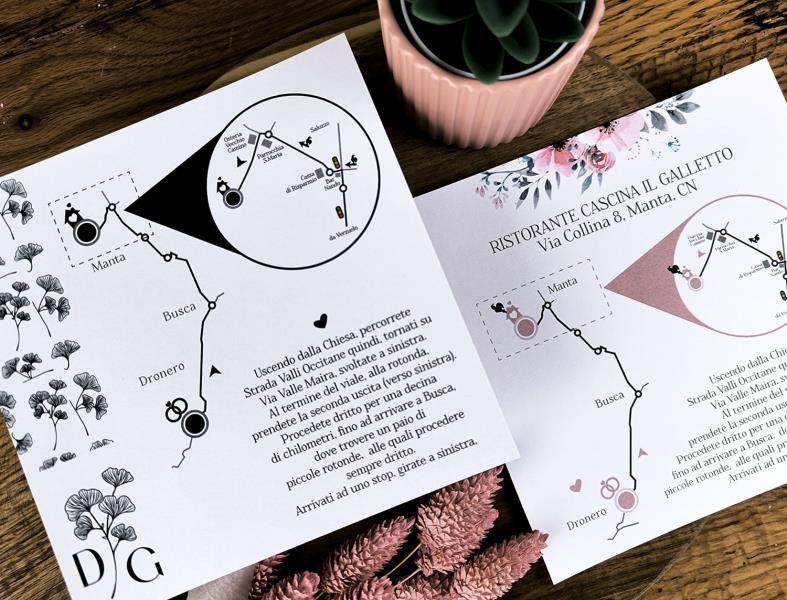 Se il luogo del ricevimento è distante da quello della cerimonia, o semplicemente la maggior parte dei vostri ospiti non conosce bene il percorso, sarà buona norma pensare di stampare una mappa. Non sarà necessario ordinarne una per ogni invitato: una per ogni auto sarà sufficiente. Potrete poi posizionarle in un cesto all'uscita dalla chiesa, oppure incaricare della distribuzione una persona di fiducia.