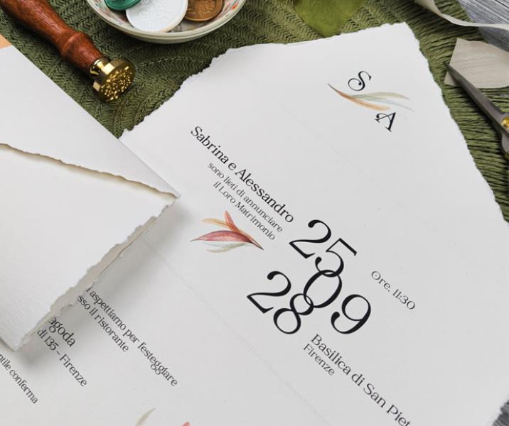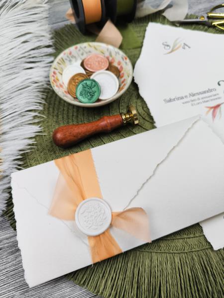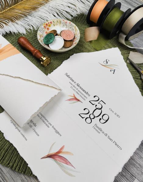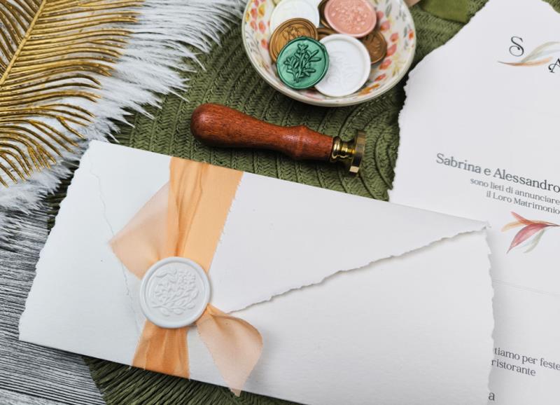 Per questa partecipazione, che si chiude su se stessa e prende la forma di una busta, la carta viene strappata a mano, con calma e pazienza, per ottenere un effetto elegante e raffinato.