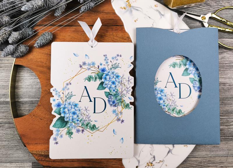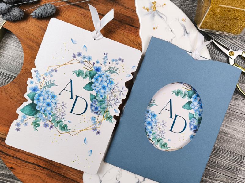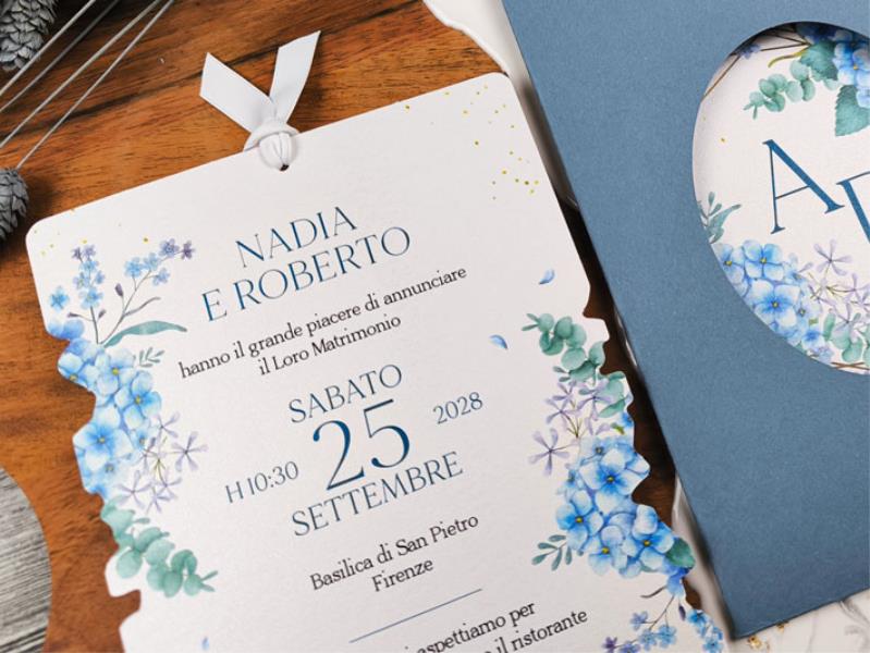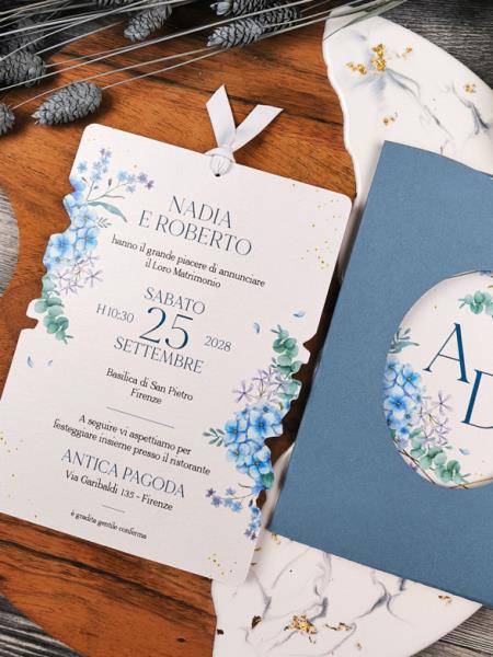 Astuccio 13x18cm in cartoncino azzurro opaco non stampato, forato anteriormente.Cartoncino interno sagomato, stampato fronte retro, finitura con nastro bianco in poliestere riciclato.Riporta sia le informazioni sulla cerimonia che sul ricevimento.Può essere completata da un foglietto per lista nozze/iban ma non richiede di essetre imbustata.