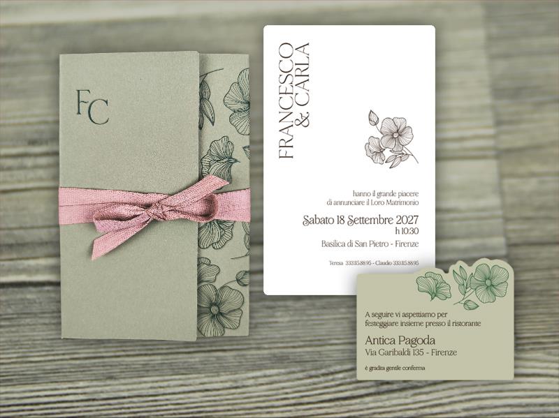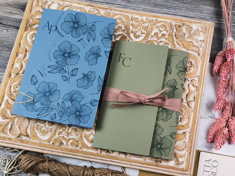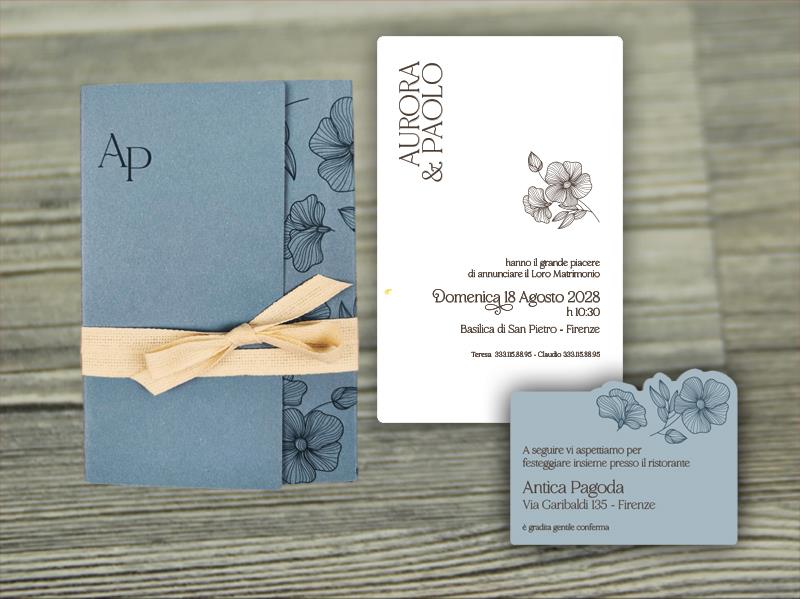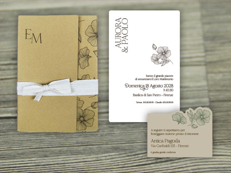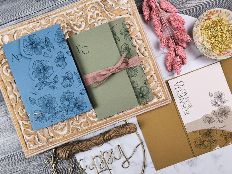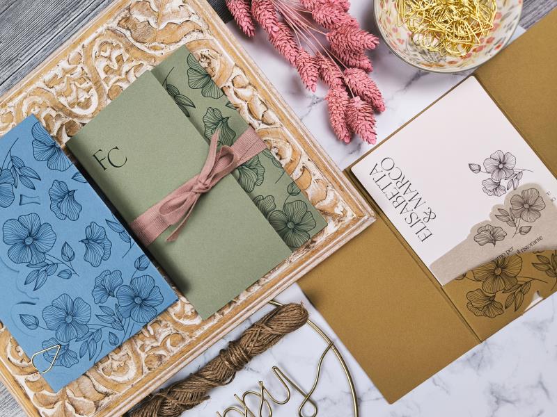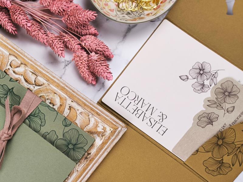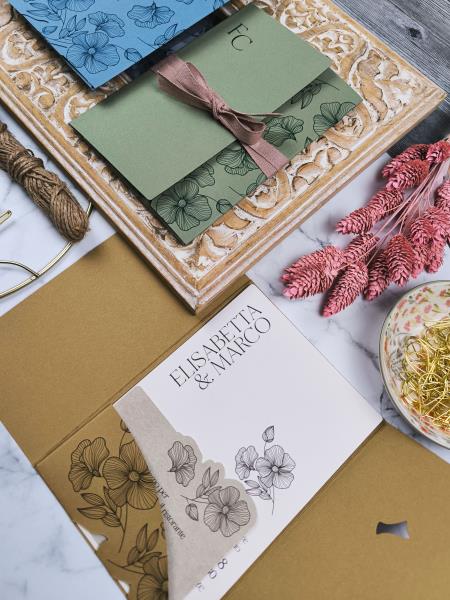L'interno, invece, è sempre lo stesso: una tasca che contiene un cartoncino grande (per cerimonia e ricevimento) e uno piccino, colorato, per lista nozze/iban.